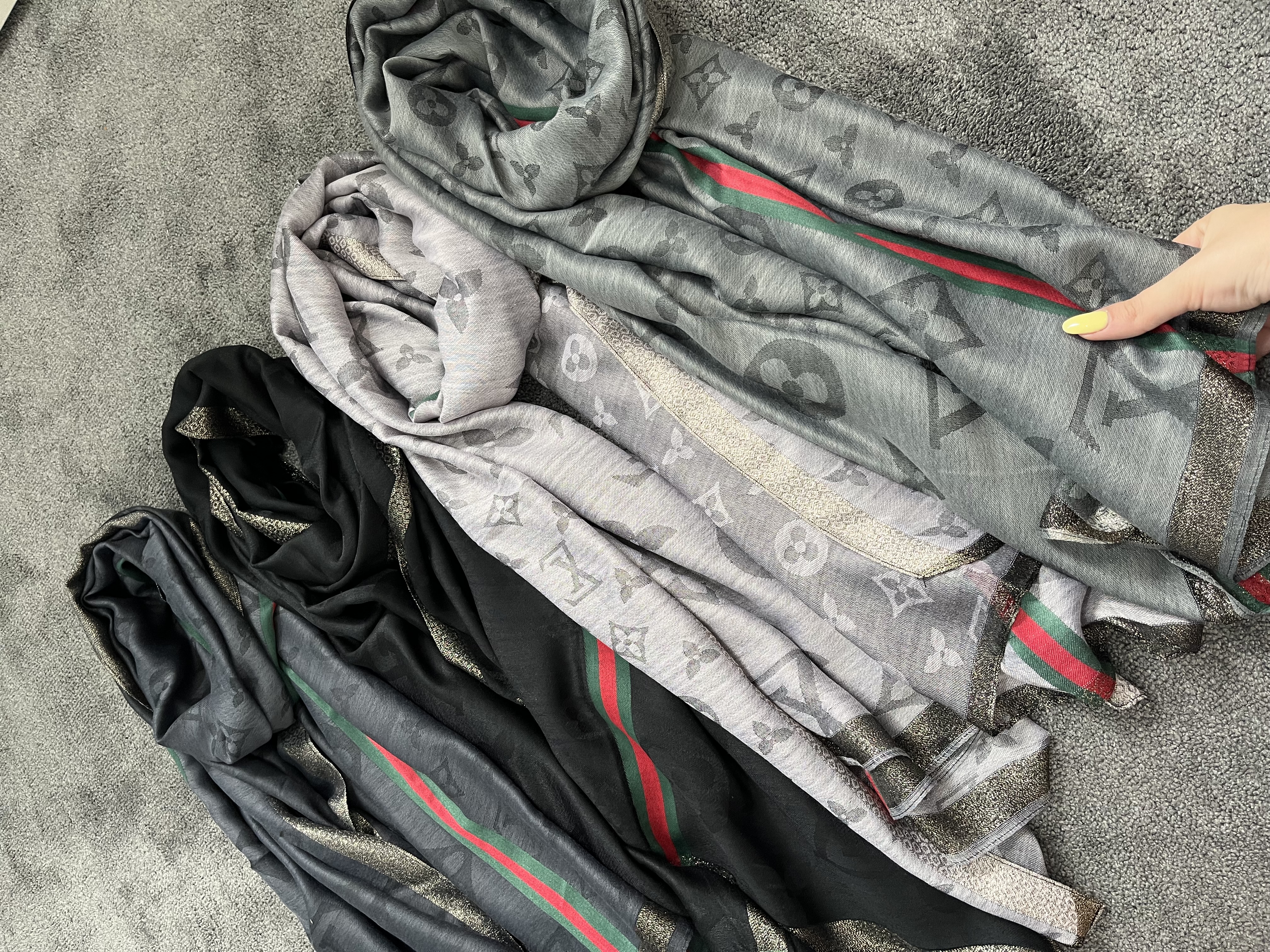 شال وارداتی دستک ماهی طرح گوچی دورگان حریر
